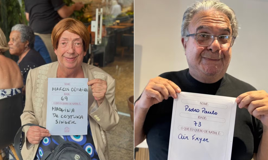 Famoso pelo personagem Beiçola, da série “A grande família”, Marco Oliveira, de 69 anos, fez um pedido simples: uma máquina de costura. O residente Marco Coutinho, de 75, quer ganhar um notebook. Suzi Soledade, de 73, deseja um micro-ondas pequeno. Pedro Paulo, de 75, uma air fryer. Marco Coutinho, deseja um ar condicionado, e Suely, de 75, quer para 2026 apenas amizade e mais empatia.