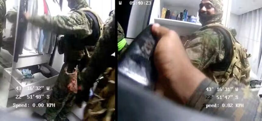 No interior da casa invadida — segundo a apuração sem mandado judicial que autorizasse o acesso —, o comportamento dos policiais destoava completamente do objetivo oficial da ação. Logo na entrada, um dos agentes abriu a geladeira, pegou uma lata de Red Bull, deu dois goles e dividiu com os amigos. Em seguida, o grupo de militares armados com fuzis percorreu todos os cômodos em uma primeira inspeção, abrindo portas de armários, gavetas e baús. Todos eles mantinham mochilas nas costas. Nesse primeiro momento, porém, nenhum deles praticou furto.