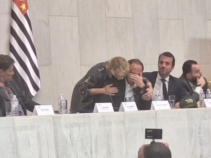 Carlos Bolsonaro chora em homenagem na Alesp: 'Obrigado por me colocarem como porta-voz do meu pai'