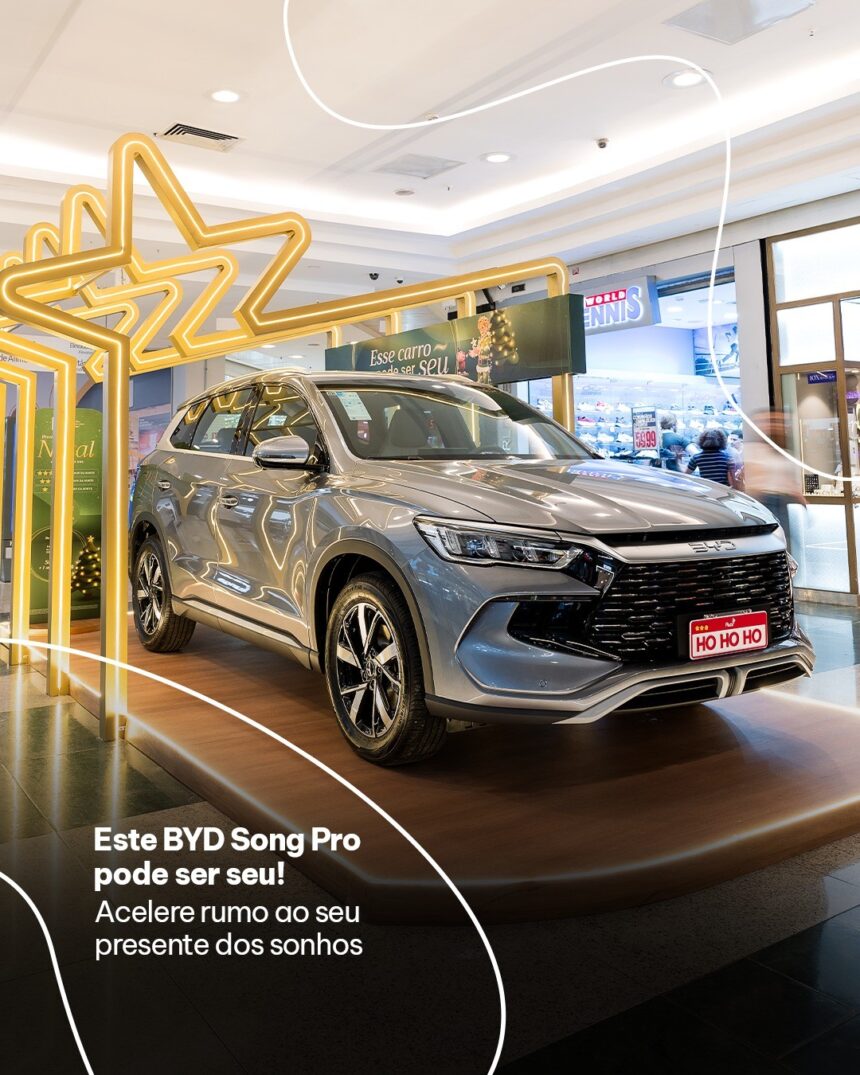 Clientes cadastrados no aplicativos Plaza participam do sorteio de um carro BYD Song Pro Híbrido 0 km, além de um ano de carregamento elétrico gratuito. Para concorrer, é preciso ativar a promoção no aplicativo e cadastrar notas fiscais de compras realizadas no shopping até 31 de dezembro — qualquer valor é aceito.