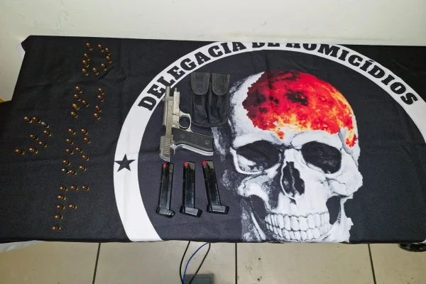 Com o indiciado foram apreendidos uma pistola calibre .380, carregada, além de dois carregadores sobressalentes, totalizando três carregadores e 45 munições, além de um aparelho celular. Ele também foi preso em flagrante pelo porte ilegal de arma de fogo.