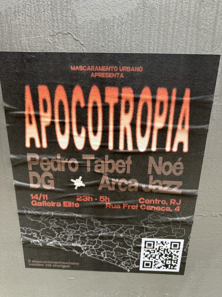 Com informações de Diário do Rio. A conhecida Gafieira Elite, no Centro do Rio, realizou no dia 14 de novembro último um “evento cultural” promovido pela produtora Mascaramento Urbano, com a participação de Pedro Tabet, Noé, DG e Arca Jazz – seja lá quem forem – na rua Frei Caneca. O evento, que seria como tantos outros de público alternativo – e proibidos pra menores de 18 anos – que ocorrem naquela região não seria tão notável se os cartazes anunciando sua realização não tivessem emporcalhado praticamente todo o Centro da Cidade.