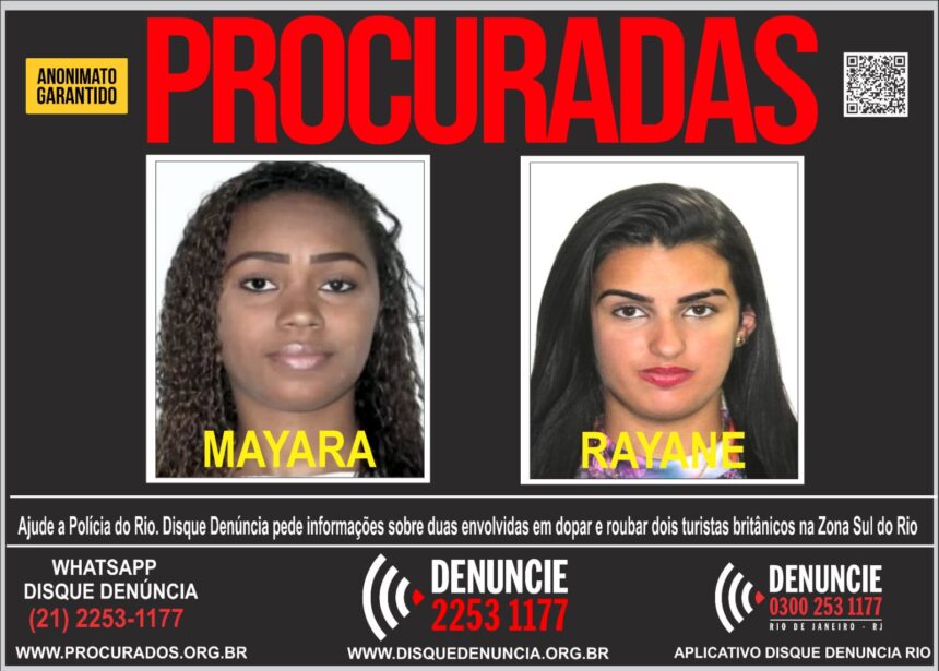 O Disque Denúncia (2253-1177) divulga, nesta terça-feira (19), um cartaz para auxiliar nas investigações da Delegacia Especial de Apoio ao Turismo da Polícia Civil RJ, a fim de obter informações que levem à localização e prisão de Mayara Ketelyn Américo da Silva, de 27 anos e de Rayane Campos de Oliveira, de 28. Elas são as principais suspeitas em dopar e roubar dois turistas britânicos, na madrugada de quinta-feira (8), na Zona Sul do Rio. Elas seriam moradoras do Complexo do Chapadão, na Zona Norte do Rio, e já são consideradas foragidas da Justiça.