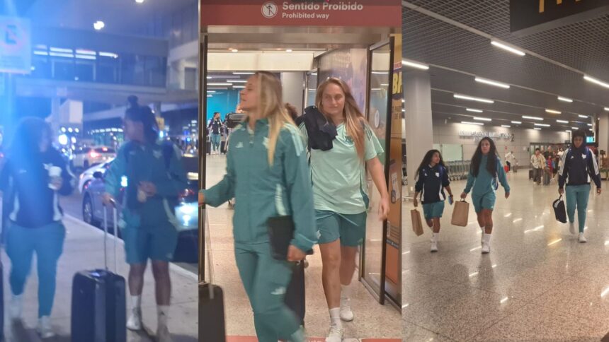 A diferença é que, ao contrário das atletas do time feminino, que viajaram em voo comercial e desembarcaram no mesmo acesso que os demais passageiros, o time masculino viajou em voo fretado e embarcou em um setor separado do aeroporto.