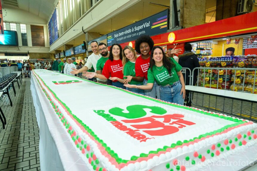 No 16º aniversário da Rede Supermarket, o presente foi de quem passou pela Central do Brasil na manhã do dia 14 de agosto: teve bolo gigante, refrigerante, pipoca e algodão-doce para celebrar o supermercado, que tem 146 lojas espalhadas pelo estado do Rio de Janeiro.