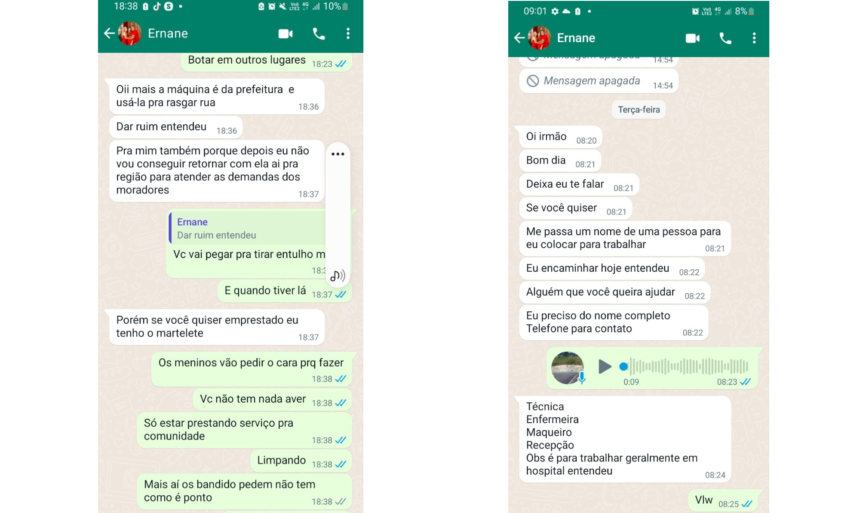 Troca de mensagens entre o vereador Ernane Aleixo (PL), de São João de Meriti e uma pessoa em que ele ofereceumaterial e suporte para construções de barricadas, além de ter negociado vagas de nomeação em troca de apoio político — Foto: Reprodução
